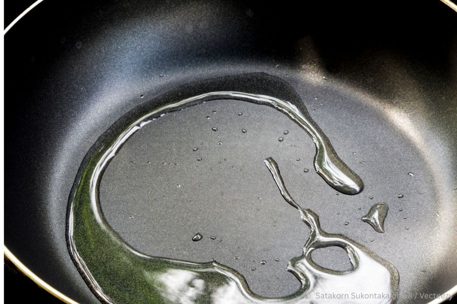 The oil slides into the pan, pooling, spreading, heat-entranced.